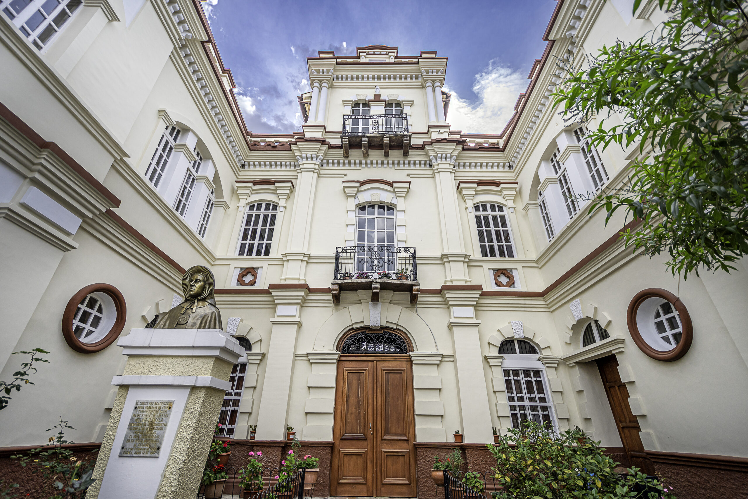 Fachada al patio frontal, casa de Emiliano J. Crespo, actual Colegio de las Madres Marianitas, Cuenca.