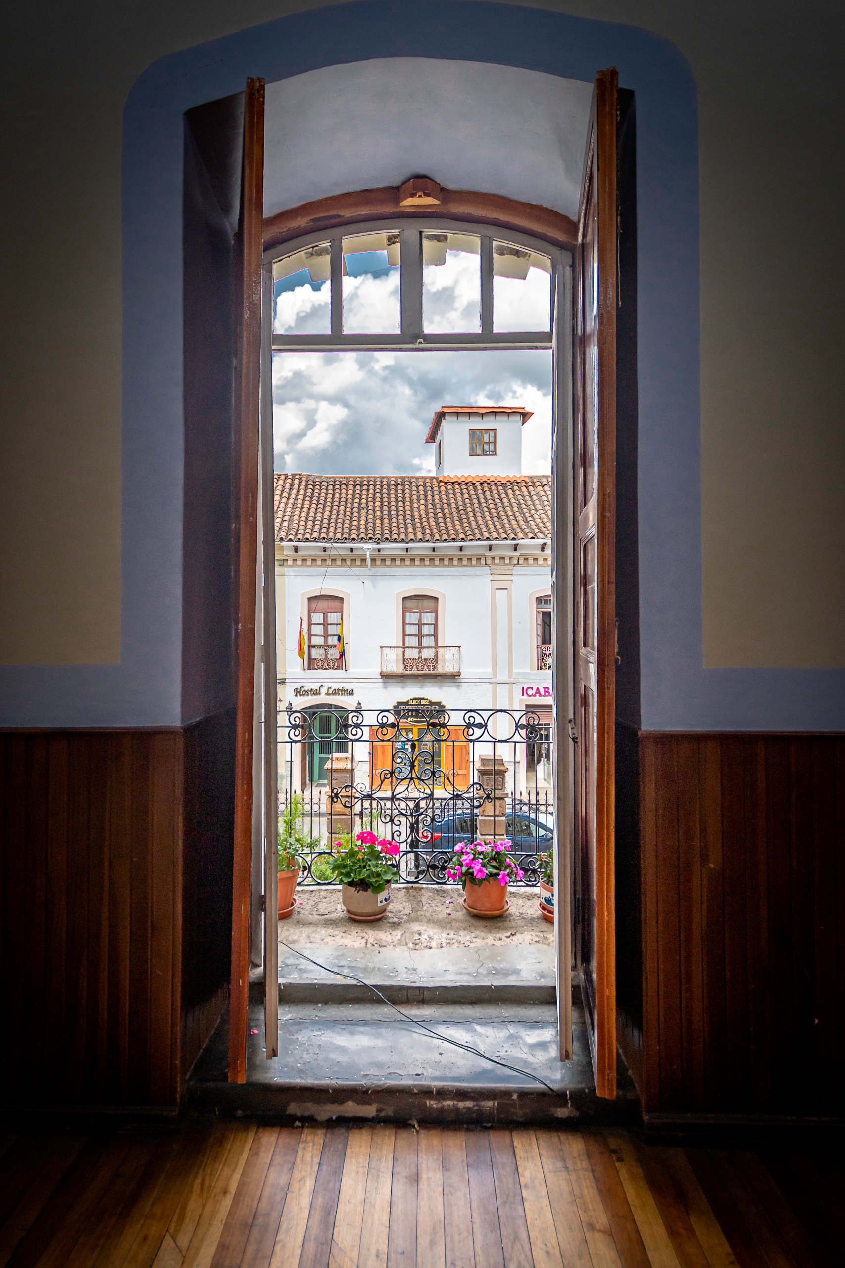 Vista hacia la calle desde la habitación utilizada como aula, casa de Emiliano J. Crespo, actual Colegio de las Madres Marianitas, Cuenca.